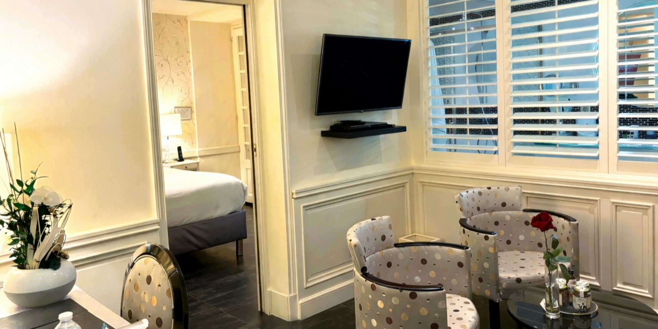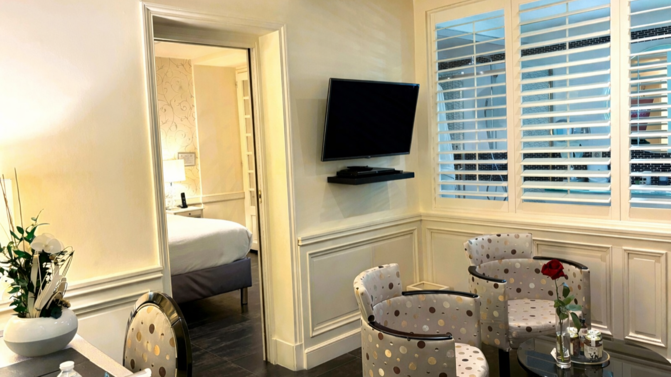 In grey, white, and black, the spaces play with light and reflections. It will be a pleasure relaxing and unwinding in this very beautiful approximately 35 m2 5-star suite, before setting out to discover Provence. You will enjoy the whirlpool bathtub and the beautiful terrace near the hotel’s swimming pool.